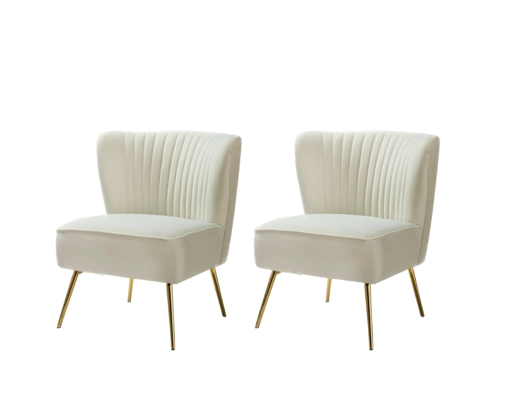 The Alice Chair Pair is exactly what you need for your wedding lounge. With its ivory velvet material and modern gold leg, this pair of chairs will complement any style. You can rent them as a pair or inquire about a single rental. Delivery is required for this item, and there are six available.