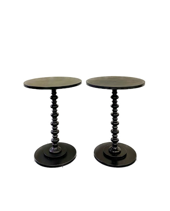 Black spindle pedestal side table pair. Sleek yet traditional look. Rented as a set of two.