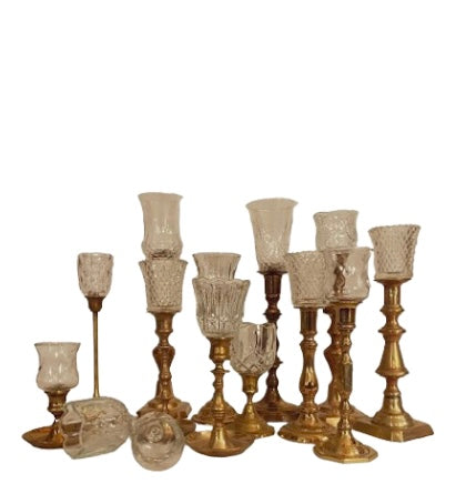 Vintage collection of clear glass peg votives. Like little lanterns they add the best ambiance. They do not stand on their own, must be paired with a candlestick or candelabra. Rental price is per peg votive, suggested to rent by the dozen for a visually pleasing mix.