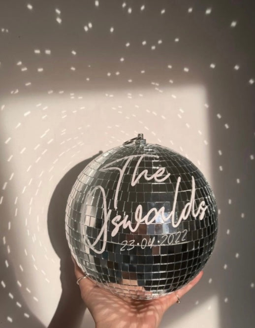 Make your event even more exciting with a personalized disco ball. Take home this charming decor piece at the end of the night and choose your own font, name, and date. Prices starting at $100 for a 12" disco ball, with customizable size options.