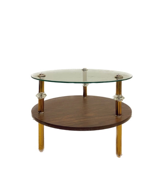 This chic and charming cocktail table exudes Hollywood Regency vibes with its wood, glass, and brass materials. Its smaller size makes it perfect for placing between two armchairs or layering with another coffee table.