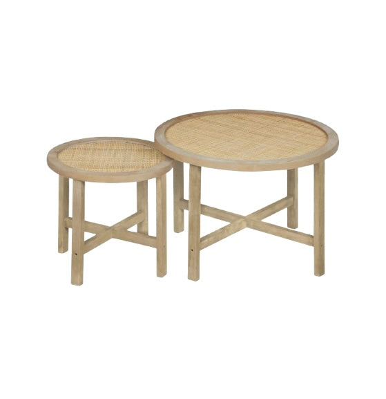 Elevate your living space with our Hadley coffee table set. Featuring a chic boho design, these tables have a sleek light wood frame and a stylish cane top detail. They can nest together for a larger coffee table or be used separately to add functionality throughout the room. Rented as a set of two, in varying sizes as shown.