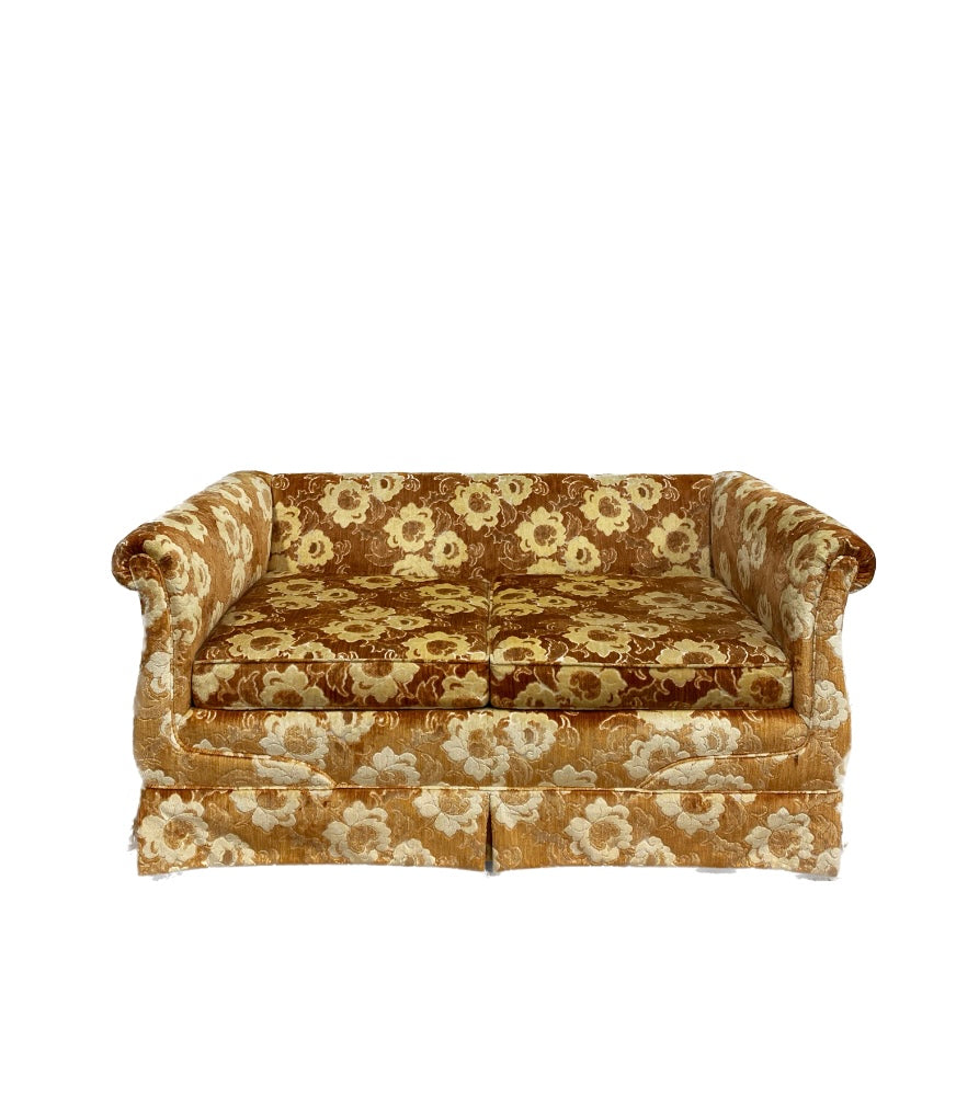 Margo is a fun vibrant loveseat. Mix of yellow orange and white in a luxe velvet fabric. Vintage sofa from the 60’s.