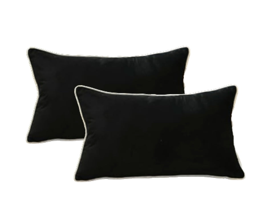 Deep black velvet lumbar pillow with with velvet piping. Rented as a pair.