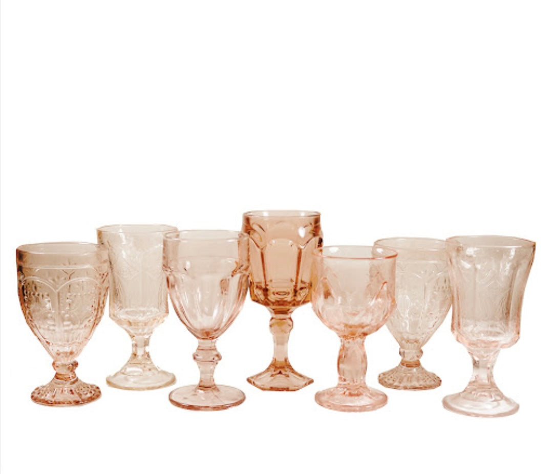 Our Rosé Goblet Collection is carefully curated with vintage pieces that coordinate in scale and color. For a desired eclectic touch, our mixed collections are strategically arranged throughout a tablescape for a collected look. If you prefer a more uniform aesthetic, we also offer larger matching sets that can be arranged together on each table. The rental price is per goblet.